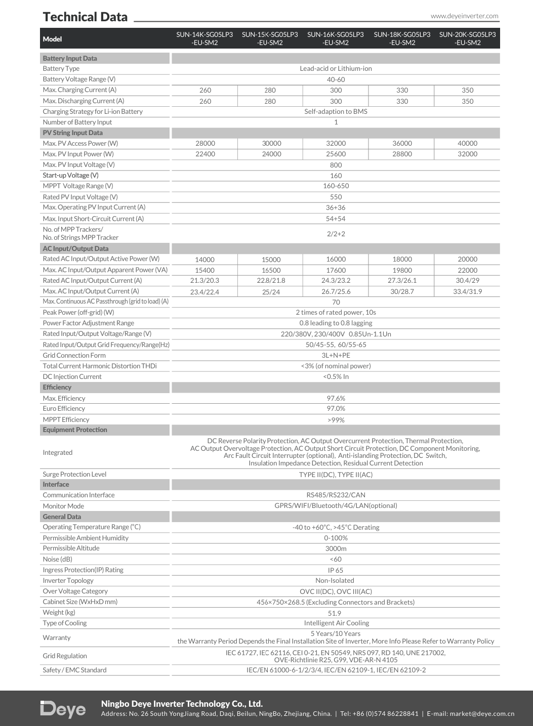 اینورتر هیبریدی خورشیدی 20 کیلووات سه فاز برند DeYe مدل SUN-20K-SG05LP3-EU-SM2